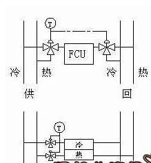 在新風風機盤管系統或風機盤管系統中。冷媒和熱媒管道在冬季和夏季運行時,采用同一管道系統,即冬季采用熱水和回水,夏季采用同一管道輸送冷凍水(和回水)。冷熱源切換在冷水泵房和換熱站進行,稱為雙管系統(雙管系統)。