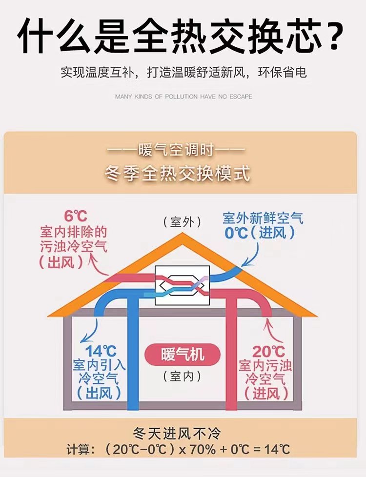 那在冬季的時(shí)候呢,還可以利用室內(nèi)暖氣的能量,對室外的冷空氣進(jìn)行預(yù)熱,再送回室內(nèi),這樣室內(nèi)的暖氣的能量損失減少,并且可以給進(jìn)入室內(nèi)的新風(fēng)加濕,因此無論是夏季還是冬季進(jìn)入室內(nèi)的新風(fēng)都可以通過全熱交換芯體,從排出去的空氣中回收能量,從而降低能耗,節(jié)約能源,達(dá)到健康舒適環(huán)保的目的,另外全熱交換效率越高,交換時(shí)損失的能量也就越少,也會(huì)更加的節(jié)能。