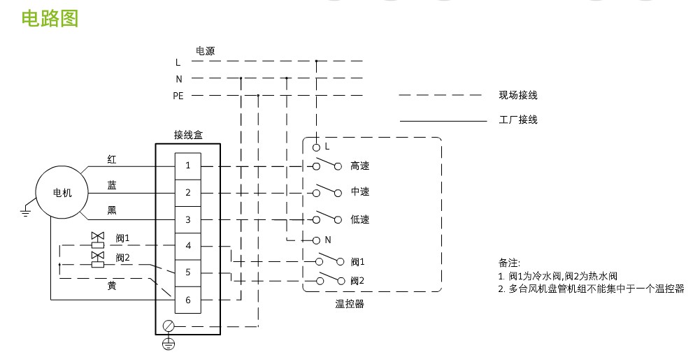 風機盤管簡單控制:使用三速開關直接手動控制風機的三速轉換與啟停。